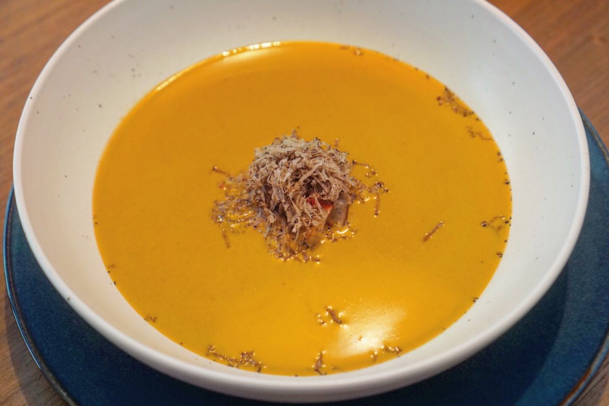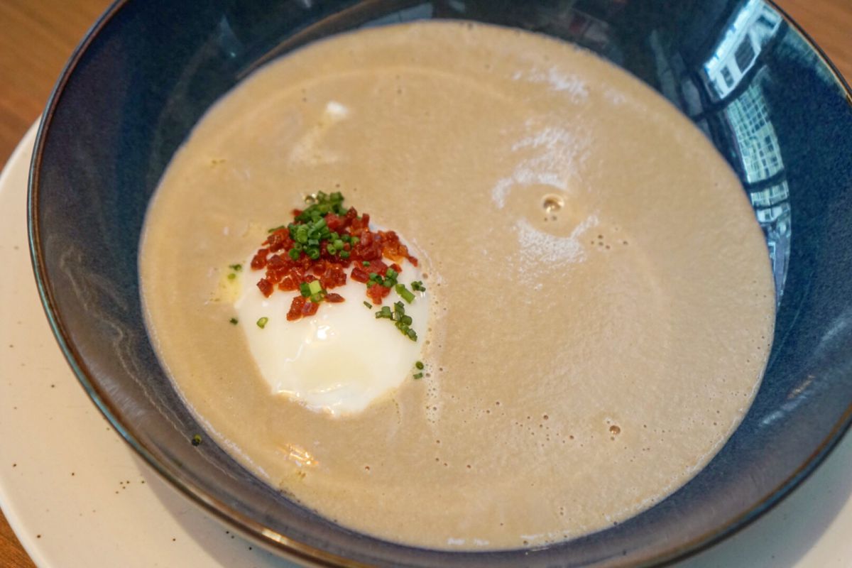 半熟卵とイベリコチョリソーのクランブルが添えられているので、旨味がぐっと増すのです!白いんげん豆のスープも濃厚クリーミーで、贅沢な味。