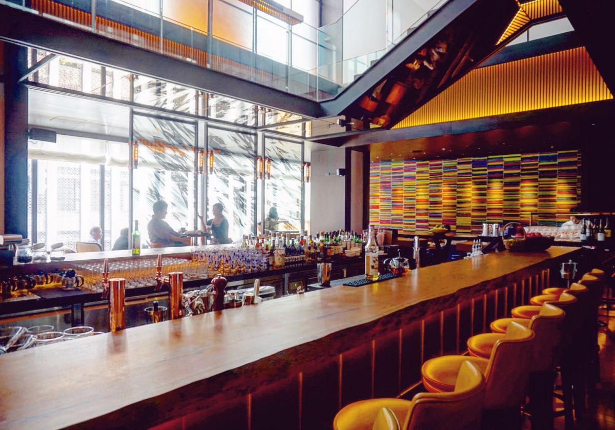 「銀座の面白さを発信する」という裏テーマもあるというこちらのホテルの3階に、本日のお目当てのお店「NAMIKI667」があります。バー&ラウンジエリアには、新聞を刷ったときに出た、色とりどりの損紙で作られたカラフルな壁が。
