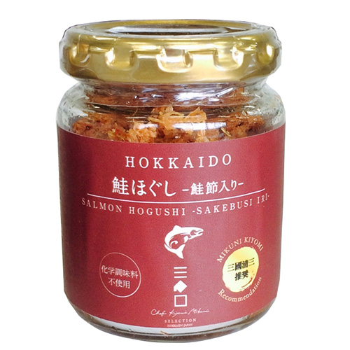 北海道出身のフレンチの巨匠・三國清三氏が厳選したお奨めの商品。北海道産秋鮭を丁寧に手でほぐし、本醸造正油のみで味付けました。更に伝統製法の手火山(てびやま)造りでつくった鮭節が入った、化学調味料不使用の鮭ほぐしです。