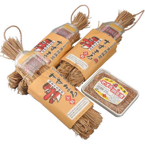 北海道産の小粒大豆「すずまる」を使った昔ながらのわら納豆。納豆と切干大根を醤油をベースに調味した「そぼろ納豆」とのセットです。
