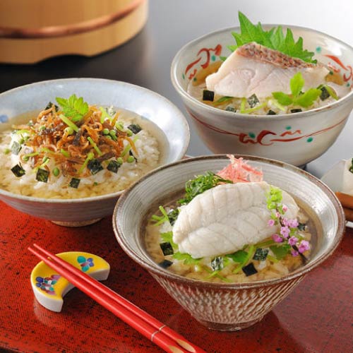 茶漬け具材に国産の真ふぐ、真鯛、ちりめん山椒を使用し、国産の鰹節と昆布でとった茶漬けだしで仕上げただし茶漬けの詰合せです。