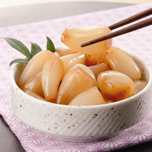 十分に乳酸発酵させた国産の歯切れの良いらっきょうを独自のたまり醤油で低温熟成させました。