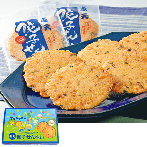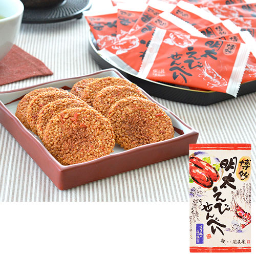 博多名物の「明太子」をトッピングしたえび煎餅です。ふわっと広がる海鮮の風味と少しピリッとした辛さがおいしいせんべいです。