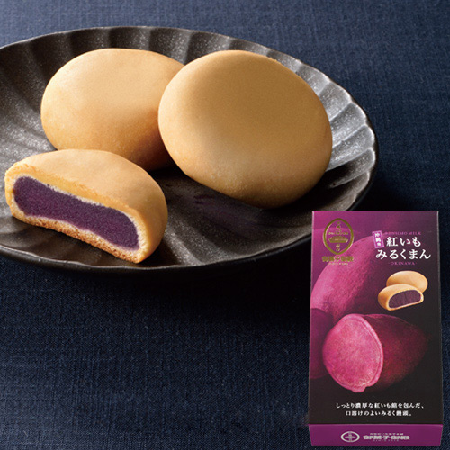 しっとり濃厚な紅いも餡を包んだ、口溶けのよいみるく饅頭です。