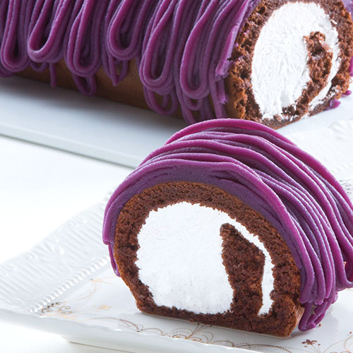 チョコをあわせたふわふわのスポンジ生地に、ほんのり紅いも色のクリームを丁寧に巻いたロールケーキ。上にはこだわりの紅いもペーストをたっぷりしぼり仕上げています。