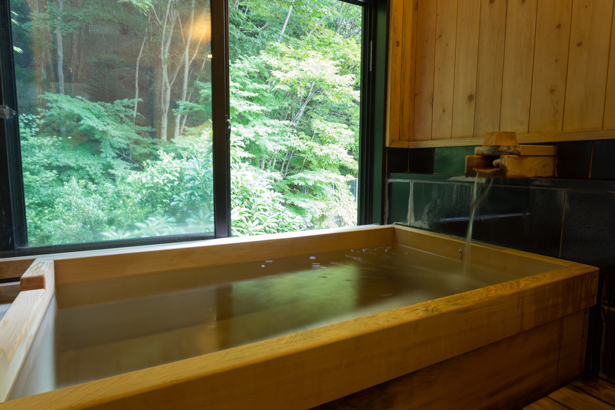 おすすめの客室は「楓」と「椛」。こちらの2部屋は、ビューバス付きです。部屋に備わる総檜風呂で、源泉かけ流しの温泉をゆったりと楽しむことができます。