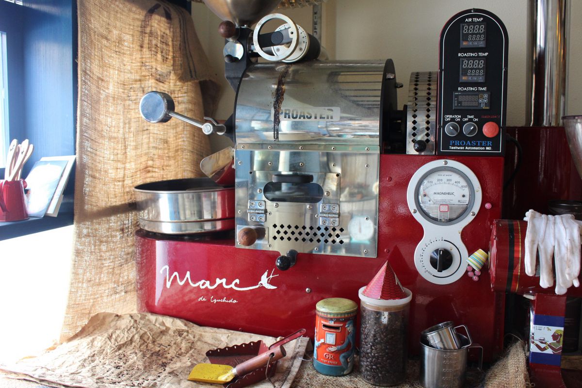 お店に入ってすぐ出迎えてくれるのは、赤が印象的なロースター。お店の要のアイテムです。焙煎した途端、どんどん風味が落ちるといわれるコーヒー豆やカカオ豆。お店で自家焙煎することで、香り高く、風味豊かなコーヒーやチョコレートが楽しめるのだそう。