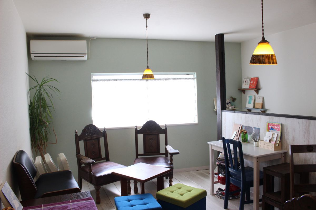 靴を脱いで2階に上がると、小さなくつろぎカフェスペースが。ここでは英会話カフェやライブが開催されるなど、地域の人の憩いの場所としても開かれています。