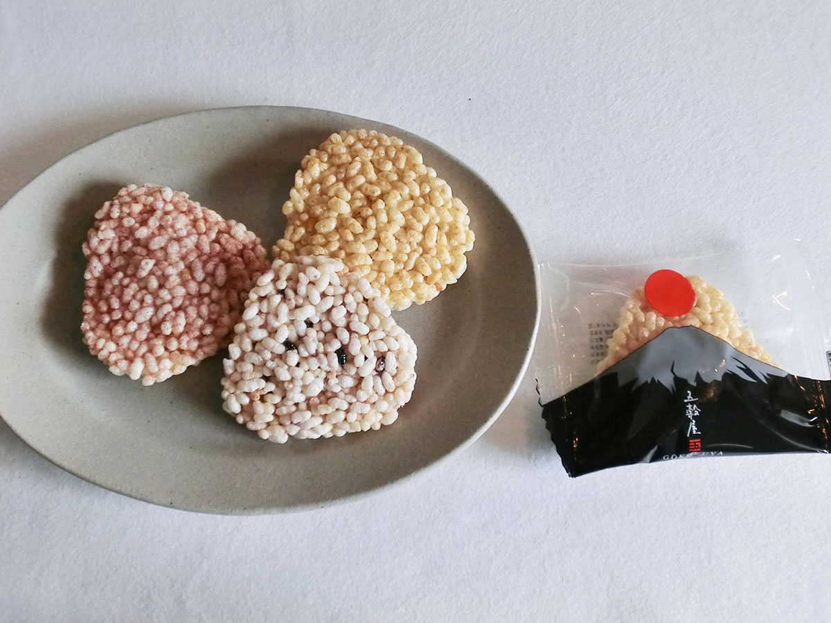 こちらは幅広い年齢層から愛されている「五穀せんべい 山むすび」。左から時計回りに、爽やかな酸味の「梅かつお」(1枚140円)、香ばしい玄米の「玄米醤油」(1枚108円)、3種の麦ともちあわ、もちきび、ひえ、黒米を配合した「七福米塩」(1枚108円)。どれも香り豊かでサクサクした食感で、手が止まらなくなるおいしさです。