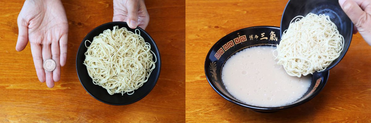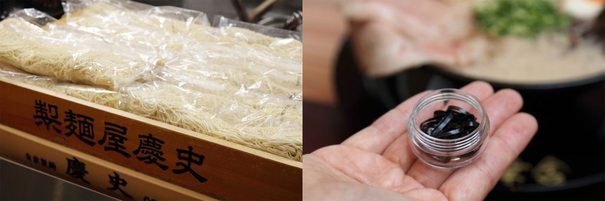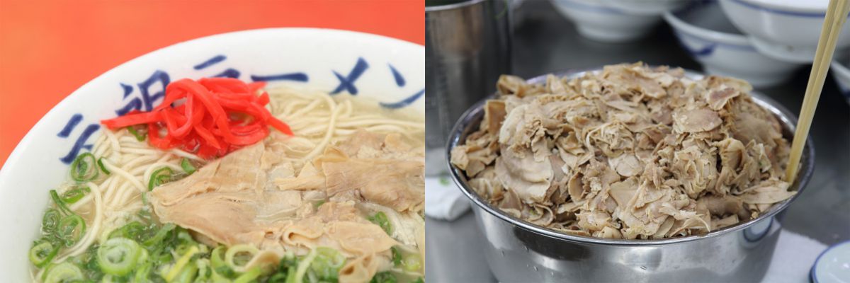 スープは子豚の豚骨のみを使用。3つの寸胴鍋で一日中、火を止めることなく骨がボロボロになるまで煮込んでいます。豚骨の香りが効いた力強い味、なのに後味スッキリ。ほとんどの人がスープを飲み干してしまうのだそう。博多織の献上柄をデザインした丼も要チェックです。