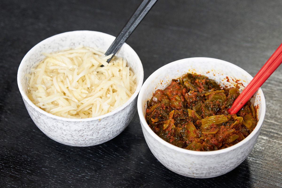 卓上にはゴマや白生姜などの薬味が並んでいるのでお好みで。なかでも人気なのが、しっかり炒めて特製調味した自家製辛子高菜。白ごはん150円をオーダーして、アツアツごはんにのっけて食べるのもおすすめ。100g250円で持ち帰りもOKなのでお土産にもぜひ。