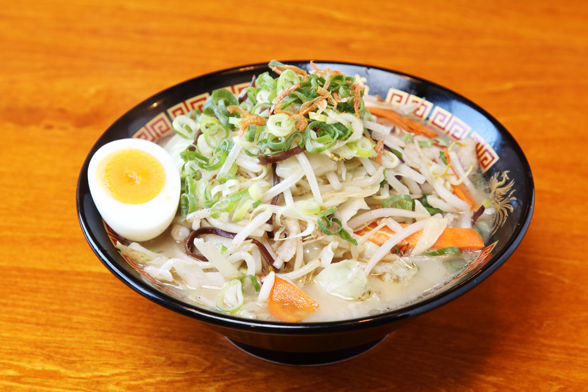 豚骨スープをベースに、ボリュームたっぷりの野菜&魚介類を炒めたものをトッピング。野菜と魚介のエキスがラーメンスープと合わさって実に深みのある味わいです。野菜は成人男性が1日に必要な量と同じ360gも入っていて、1杯で栄養満点なんて嬉しいですね。