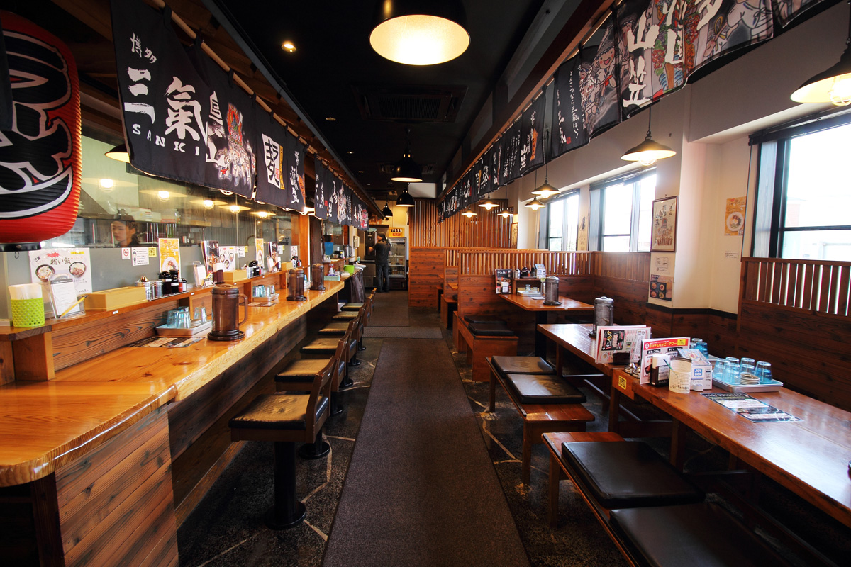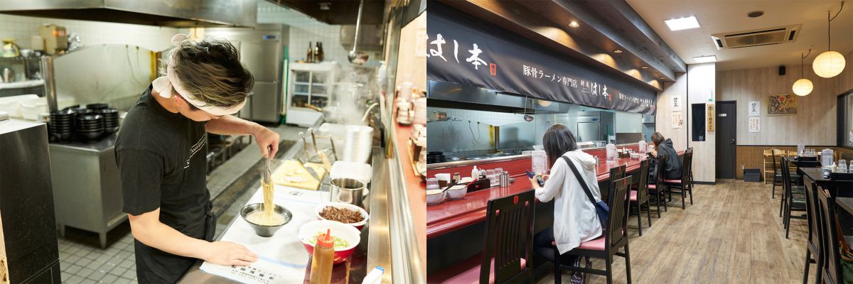 外から中が見えるガラス張りの店内は、木のぬくもりと白をベースにしたモダンな雰囲気。「三味線とラーメンは合う!」という店主のこだわりで、和楽器の軽快なBGMが流れる中、博多の味を満喫できます。