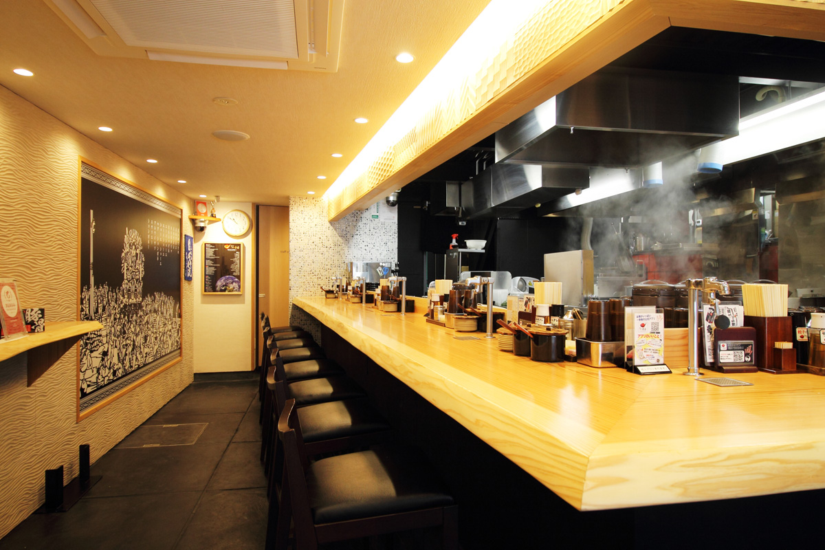 広々とした店内は、おひとりさまの女性も気兼ねなく入ってきては、カウンター越しにスタッフと会話する姿が印象的。立ち上る湯気や麺切りの技を眺めながら、ゆっくりくつろげるお店です。