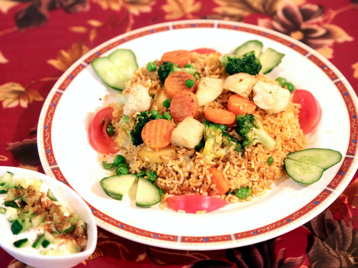 そして、ゴロッとした具がたっぷりの「ベジタブルビリヤニ(スペシャル)」(1800円)も外せません!動物性タンパク質は一切使っていないのに、スパイスがしっかり効いていて野菜のうま味も出ているので、ヴィーガン料理でよくある“物足りなさ”が全然ありません。写真左のライタ(インドのディップのようなもの)で味変もできますよ。