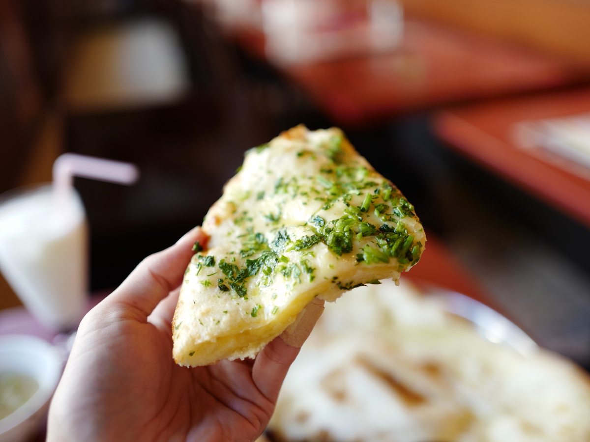もっちりした厚めの生地の中にはチーズがたっぷり!手に持つと重みでわかるのですが、1ピースでもかなりの満足感。ナンは、プレーンはもちろん、桜えび入りの「桜ナン」(350円)や「ガーリックナン」(350円)など充実しているので、数種類をみんなでシェアすると楽しそう!