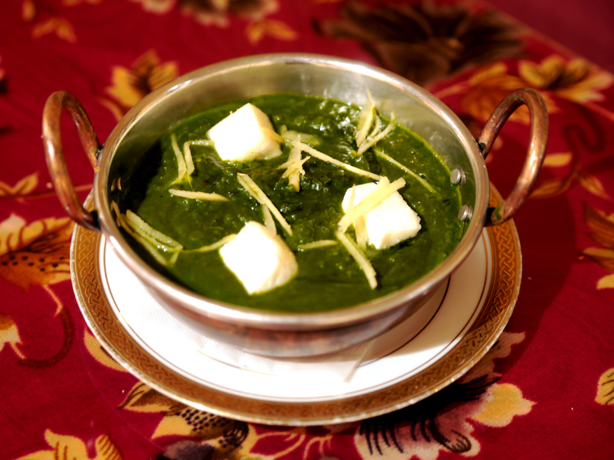 女性に特におすすめなのが、ほうれん草をたっぷり使ったヘルシーな「ほうれん草とカッテージチーズのカレー」(980円)。ほうれん草約300gを石臼で細かく挽いて作られたルーは、濃厚かつ口当たりなめらかで自然な甘みがクセになりそう!上にのせたインド産のチーズと刻みショウガがアクセントになって、さらに◎。