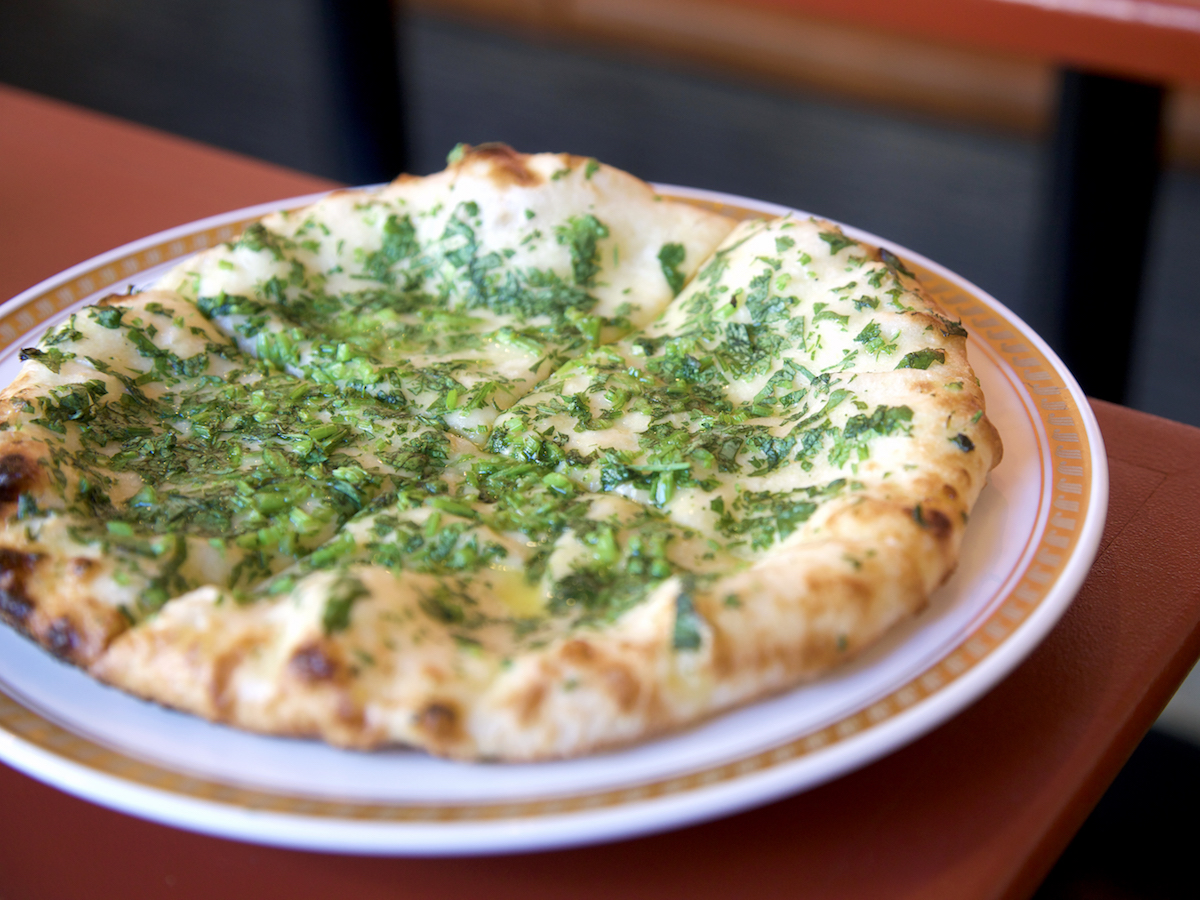 おすすめは、こちらの「パクチーチーズナン」(550円)。チーズ入りのナンの上に、パクチーがたっぷりトッピングされた人気メニューです。