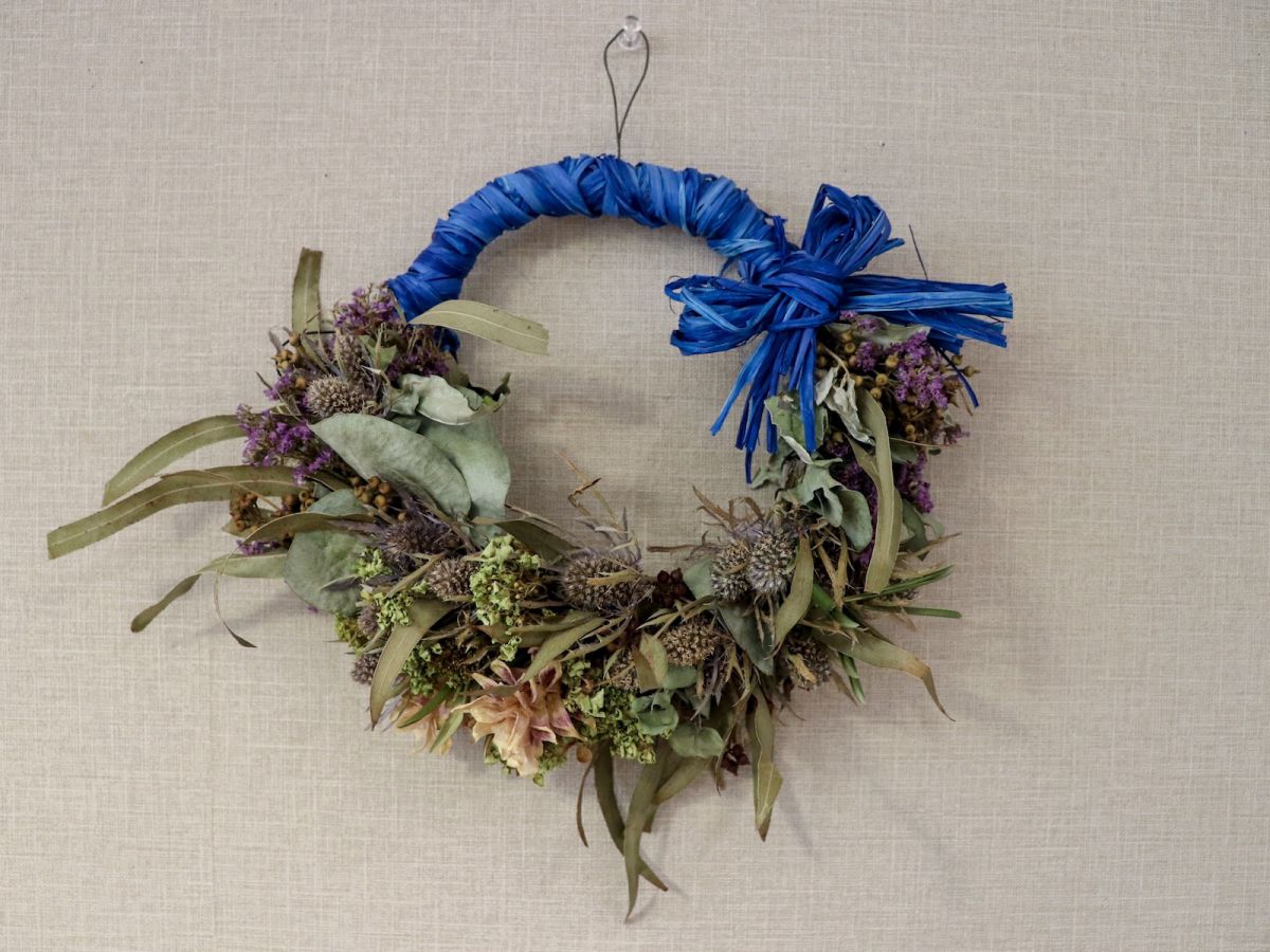 リースは、ワークショップで手作りするだけではなく、アレンジされたものを購入することも可能です。こちらのリースは、ショウガの花やユーカリの葉をメインに作ったもの。グリーン系の花材は特に色がキレイなドライフラワーに仕上がるのだとか!