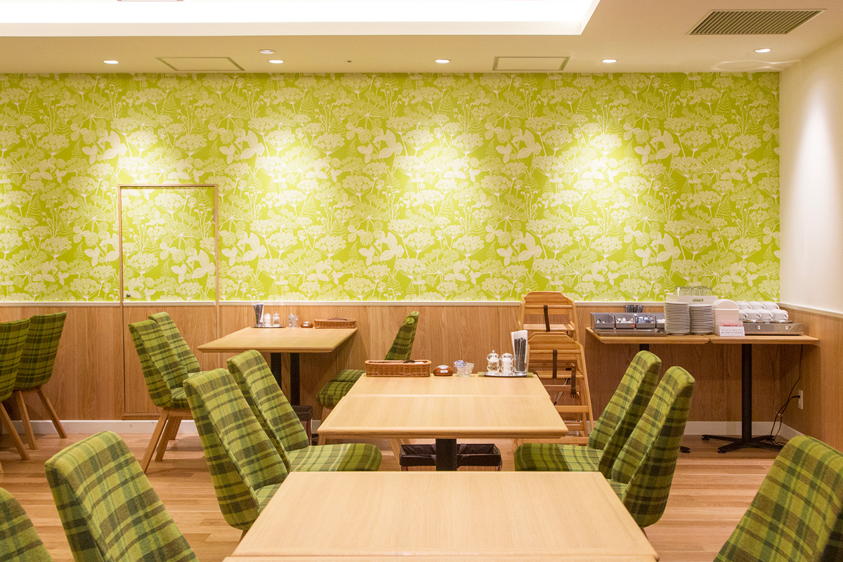 グリーンを基調としたコーナーはナチュラルな雰囲気。緑のチェックのチェアが配され、ライトグリーンの壁には繊細なタッチで植物が描かれています。