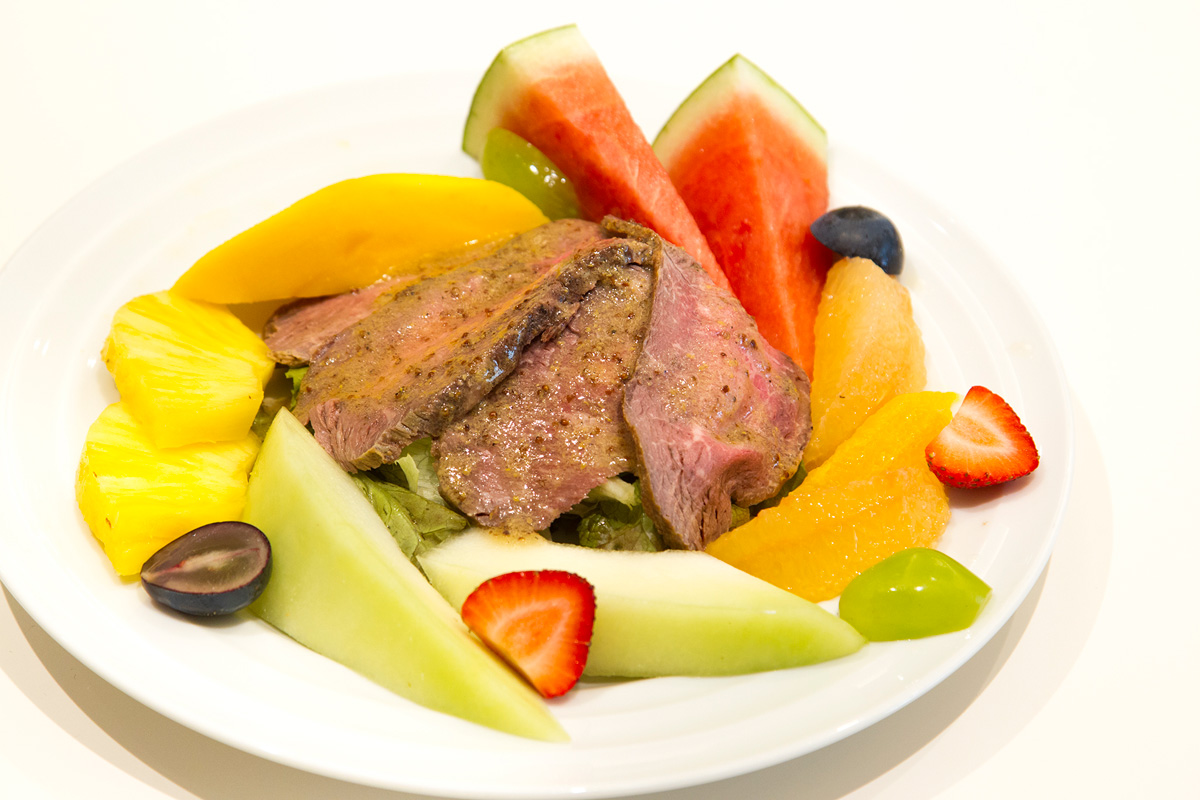 写真は周りにたくさんのフルーツを盛り付けたローストビーフ(パンorライス付きで1382円)。レアに仕上げた牛肉の下にはレタスが隠れていて、粒マスタードと醤油を効かせたオニオンドレッシングをかけて、サラダ感覚で味わえます。