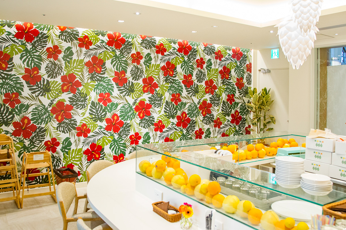 入口右手、カウンター席の後ろは鮮やかなハイビスカス柄の壁。この壁をバックにスイーツを撮影するとフォトジェニックな1枚が撮れそうです。