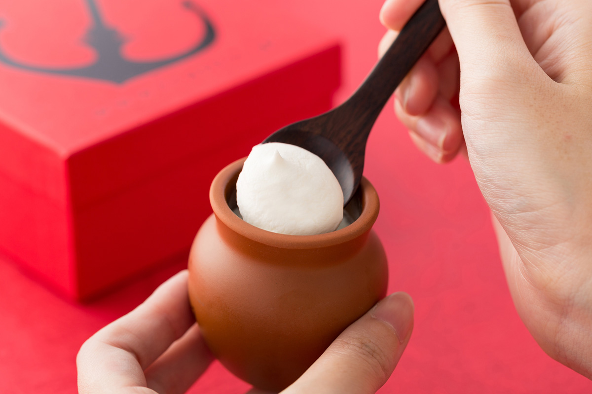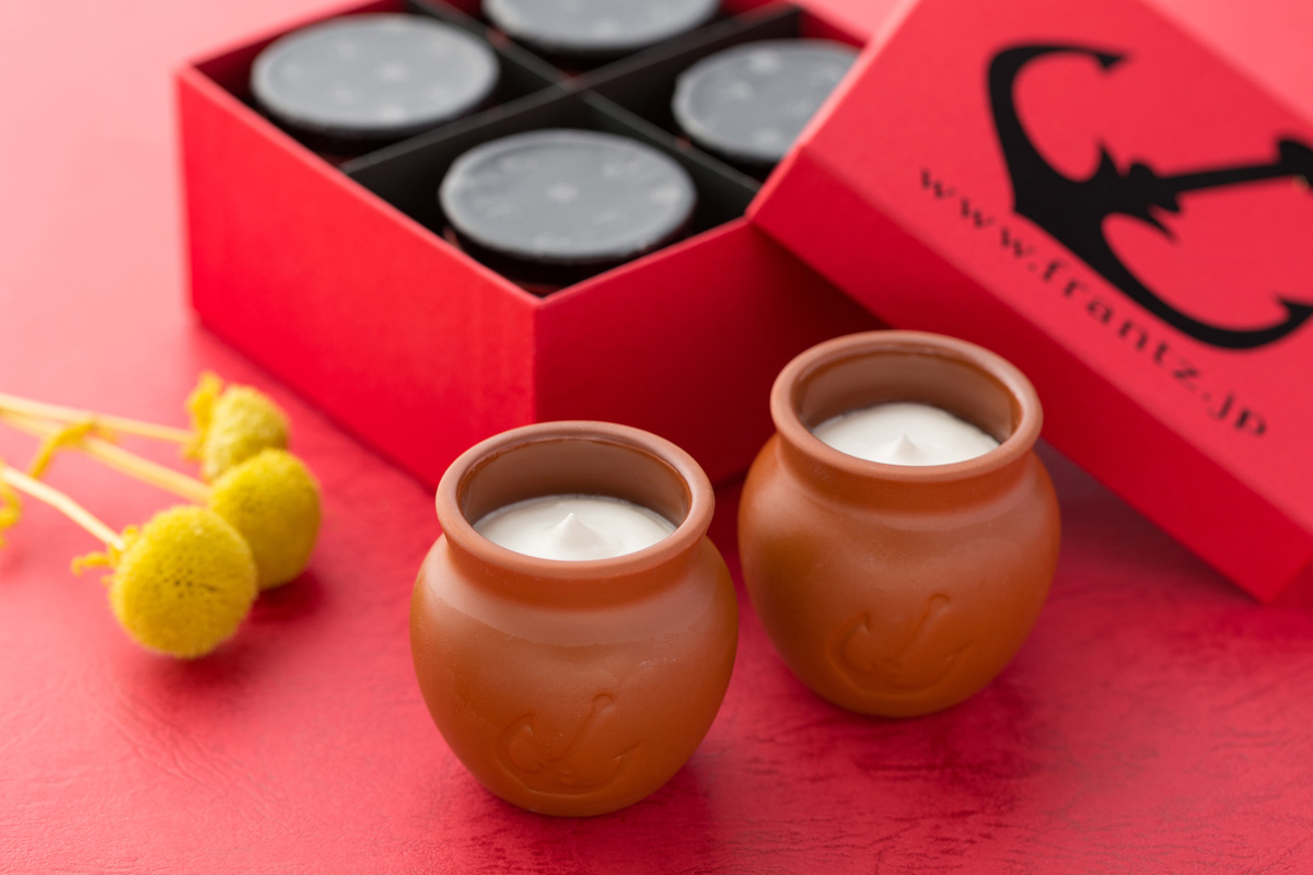 真っ赤な箱から顔を出すのは、とってもキュートな神戸フランツの「神戸魔法の壷プリン®」4個入1560円。小さな壷に入った見た目は、手土産にすれば「かわいい!」のひと言をもらえるはず。