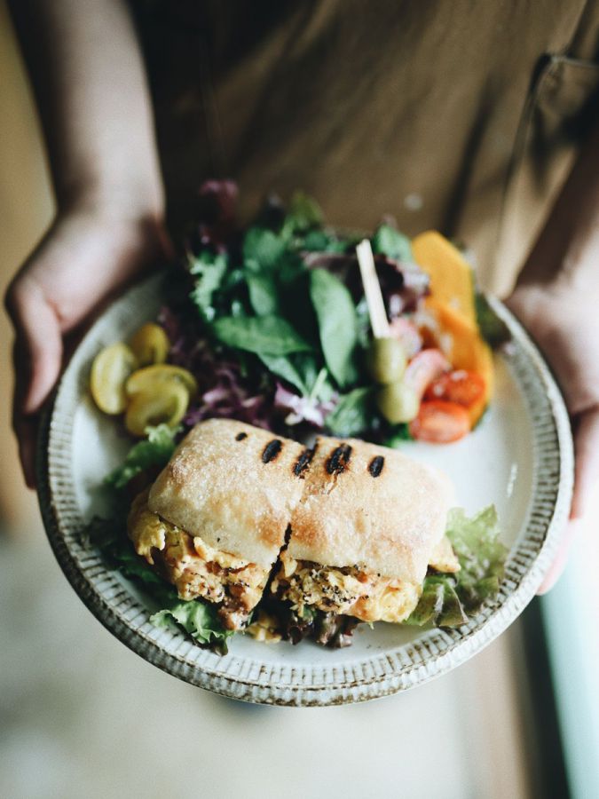 こちらはイートイン限定の厚切りベーコンとスクランブルエッグのサンドプレート(750円)。「普段野菜を食べる機会が少ない人にも、新鮮な野菜をたっぷり食べてもらえる店を作りたかった」と話すオーナー宮川さん。プレートは新鮮なサラダと共にサーブされ、栄養バランスにも配慮されています。