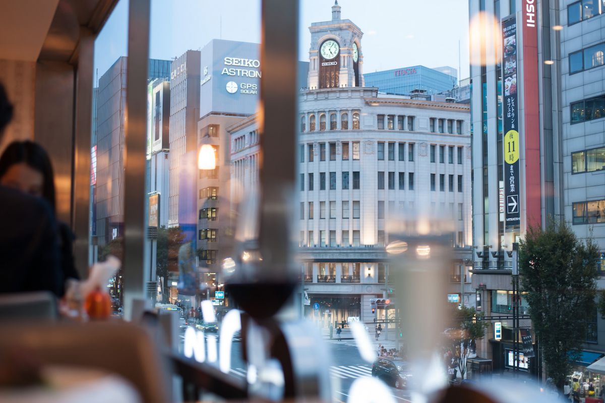 窓の外には、銀座のシンボルである和光の時計台も。銀座の街並みをゆったりと楽しめる窓際の席が大人気なのだとか。