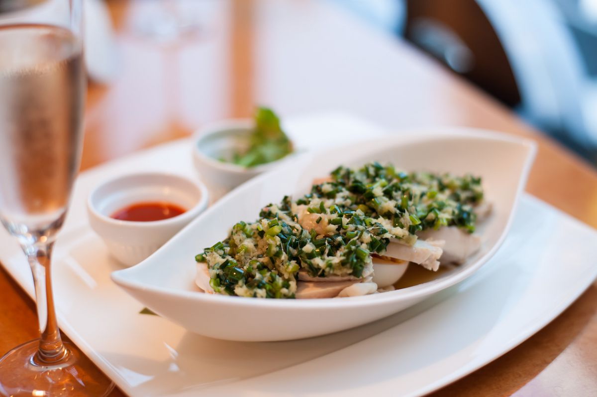 写真は、生姜とネギがたっぷりとトッピングされた「ジンジャーオニオンチキン」。シンガポールのローカルフード「ハイナンチキン」を、日本人の舌に合うよう、アレンジした一品なのだそう。