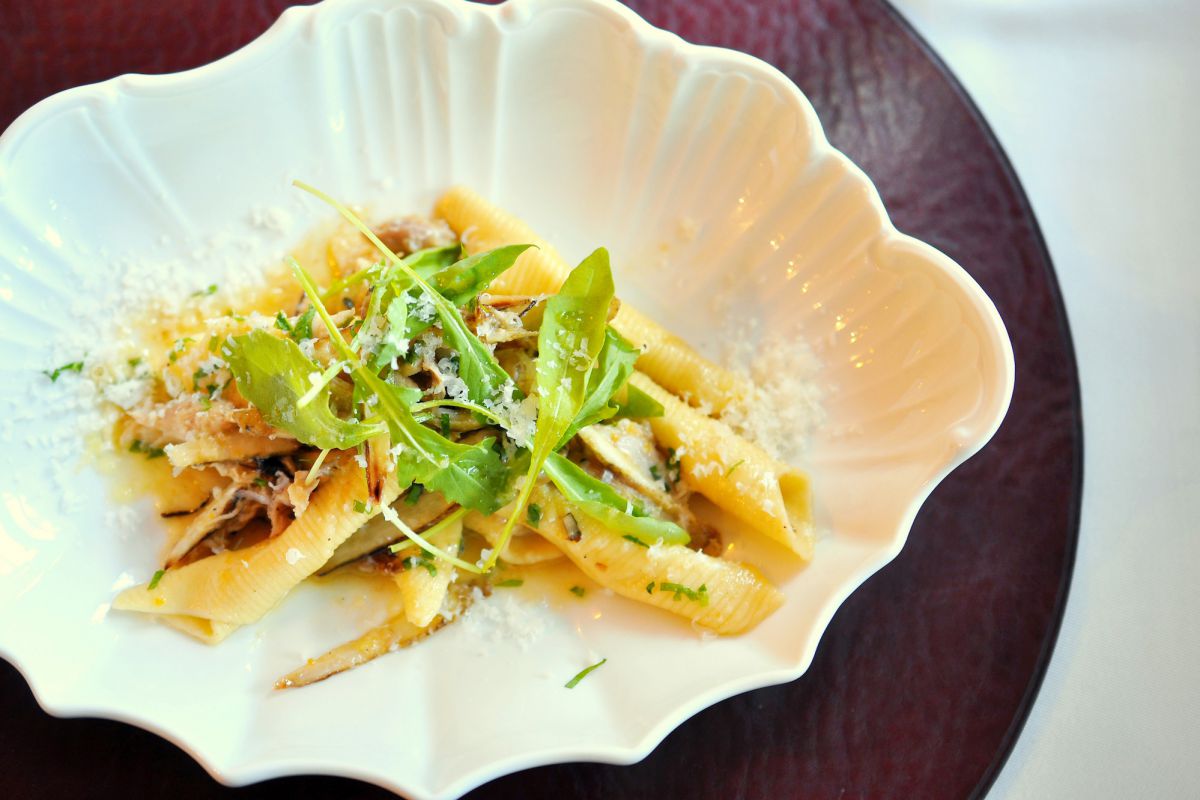 ちょっと不思議な形をしたこのパスタ、「ガルガネッリ」という、エミリア・ロマーニャ地方の伝統的なパスタだそうです。お店では、10種類もの手打ちパスタを1日2回仕込んでいるとのこと。しっかりした歯ごたえと深い味わいは、思わずうなってしまうおいしさです。