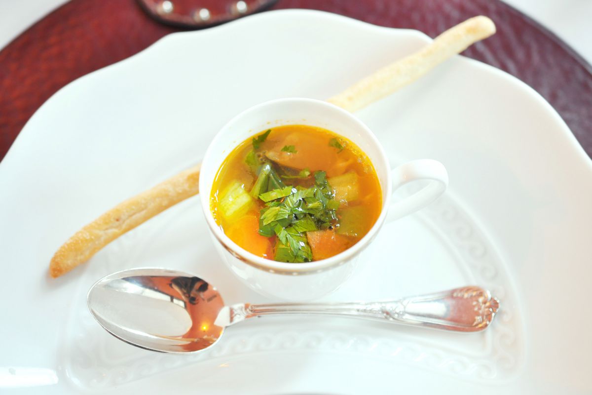 まずは有機野菜のミネストローネ。にんじん、ナス、セロリ、いんげんなど、野菜たっぷりのあったかスープにほっこり。クリスピーな自家製グリッシーニと一緒に食べてもおいしいです。