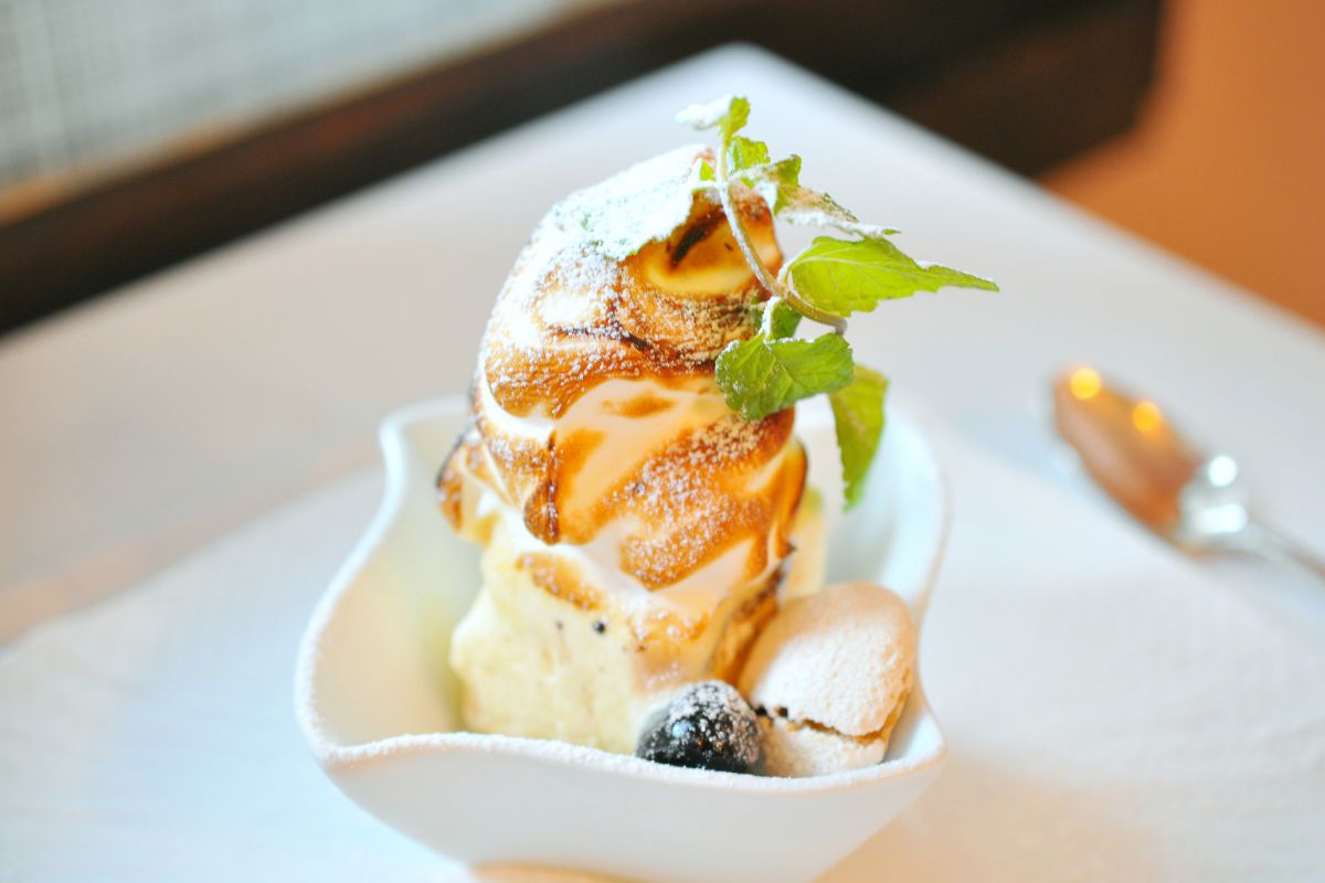 チョコメレンゲを土台にしたはちみつ風味のジェラートは、自然な甘み。直前に炙られたメレンゲの香りにうっとりしてしまいます。