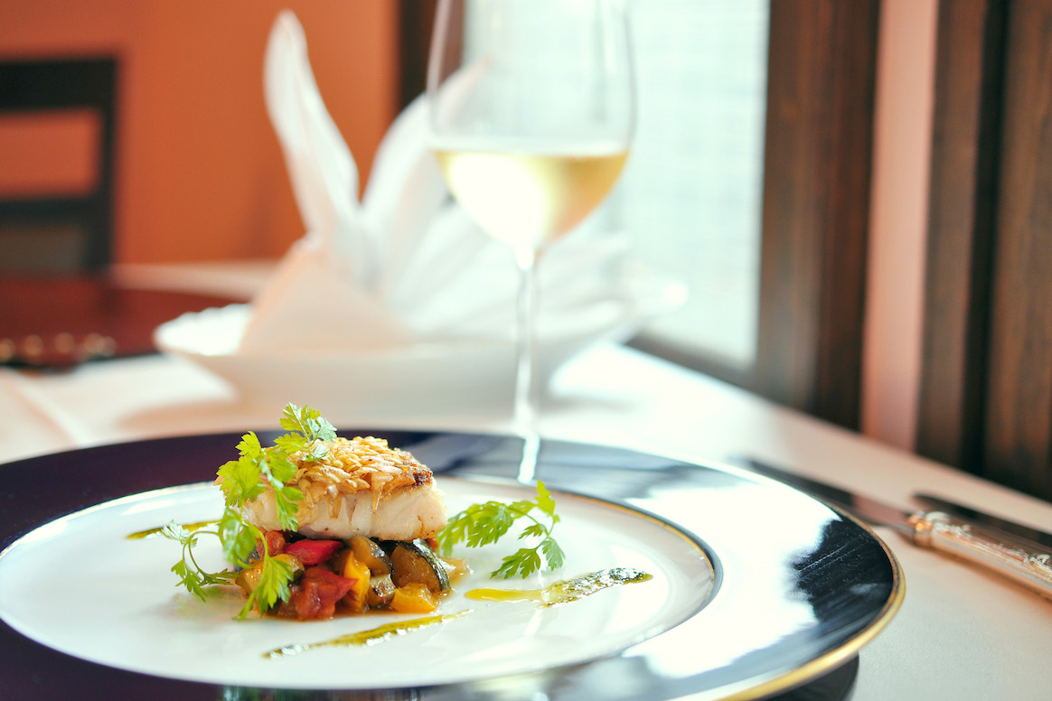 まずは魚料理。長崎産のシロアマダイに、野菜をトマトで煮込んだ「カポナータ」を添えています。シロアマダイは、うろこを多めの油で焼き上げて、カリっとクリスピーに。香草のソースがふわりと香り、白ワインが進みます。