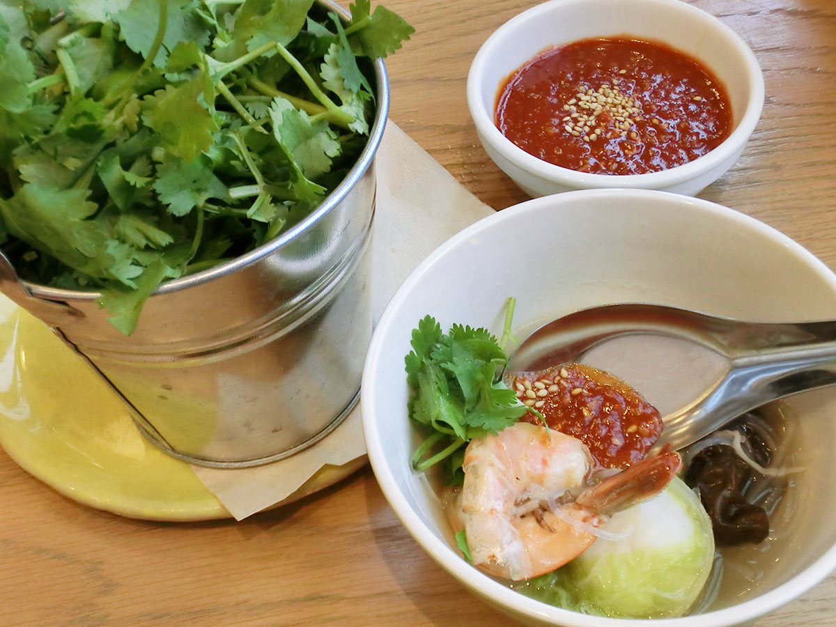 パクチーは鍋に入れてもよし、取り分けた小皿に加えながら食べてもよし。好みでスパイシーで甘辛い「タイスキソース」も少し加えてみます。結構辛いので、入れすぎにはご注意を!