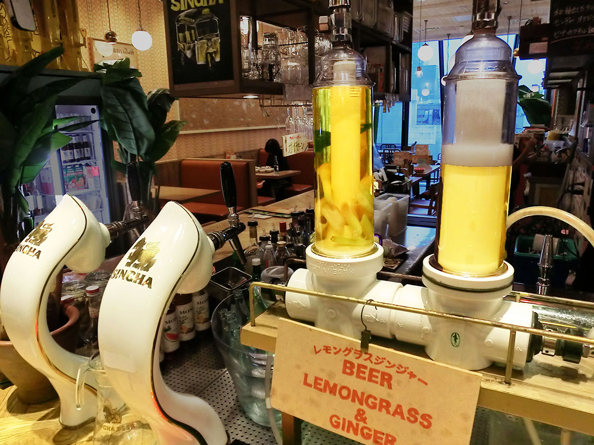 透明なパイプの中にフルーツやハーブ、スパイスなどを入れて生ビールを通過させて注ぎ、香りをつける仕組みになっていて、女性でも飲みやすい味わいに。季節によって内容が変わり、この日はレモングラス&ジンジャーと柚子レモンの2種類がありました。