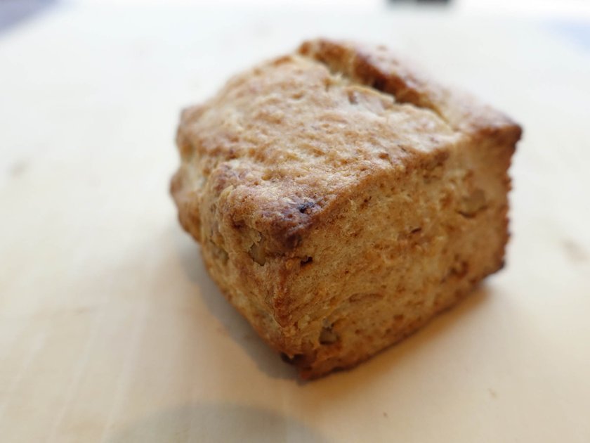 「全粒粉とくるみのスコーン」(250円)は、全粒粉のプチプチとした食感と、しっとりしたスコーンの生地が、甘すぎず素朴な味で何度も食べたくなるおいしさです。