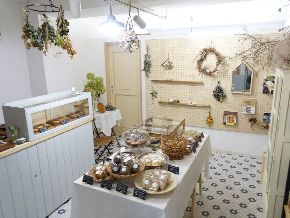 ドライフラワーが飾られた落ち着きのある店内は、とにかくおしゃれで女性にはたまらない空間。スコーンやクッキーなどの焼き菓子・季節の果物を使ったタルトやマフィンなど、お店は甘い匂いで満たされています。