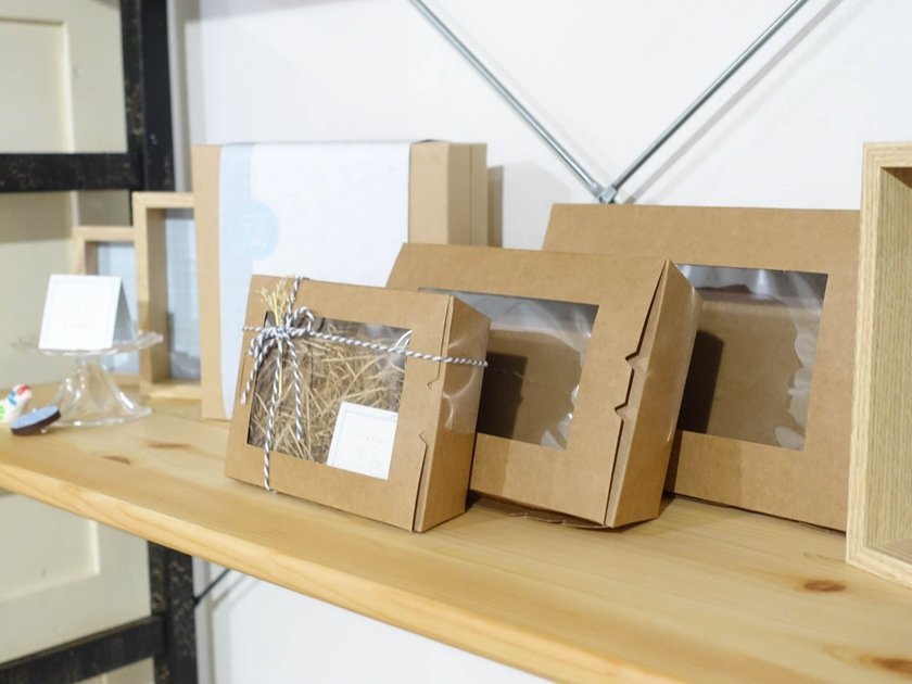 お店では、購入したお菓子をおしゃれにギフトラッピングしてもらえます。ラッピングは、お菓子に合わせてサイズの違う3つの箱から選べます。