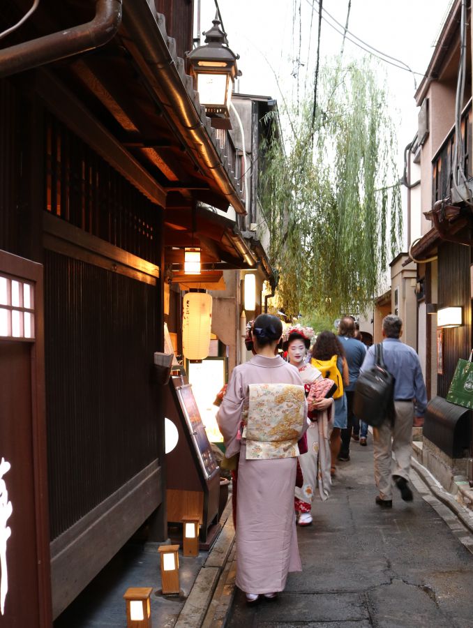 飲食店が集まる木屋町通りと鴨川の間にある先斗町。学生さんが多く、賑やかな木屋町に比べて、先斗町はしっとりとした雰囲気。お茶屋さんへと出向く舞妓さんの姿も見られます。
