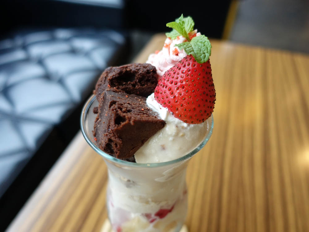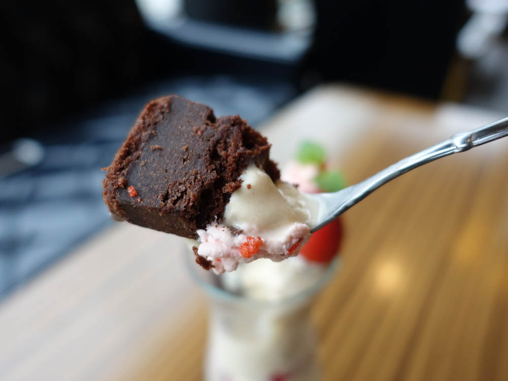 ガトーショコラはしっとりとした口当たりで、甘すぎない大人な味。いちごのクリームには、フルーツクランチがかかっています。ヘーゼルナッツアイスとバニラアイスはあわせて3玉も!それに加えてさっくさくのパイの食感も楽しいパフェです。