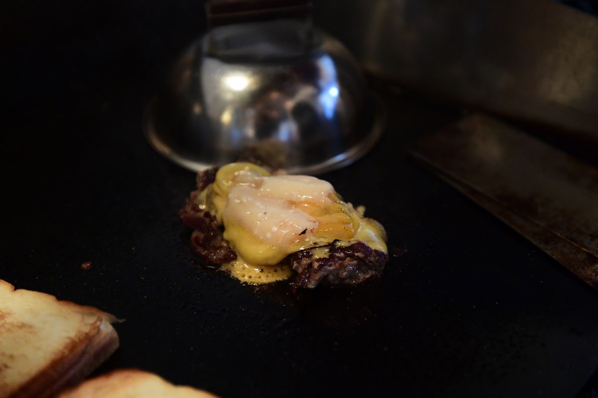 主役は、厚めにスライスしたアメリカ産のリブロース。アツアツの鉄板でグリルし、程よく火が通ったタイミングでチェダー、モッツァレラ、パルミジャーノ・レッジャーノと3種のチーズを乗せたら、ボウルでふたをして待つこと数分。チーズがとろけ、なんともゴージャスなパティに!グリルオニオンとともに、同じ鉄板で焼いたパンでサンドすれば完成です。