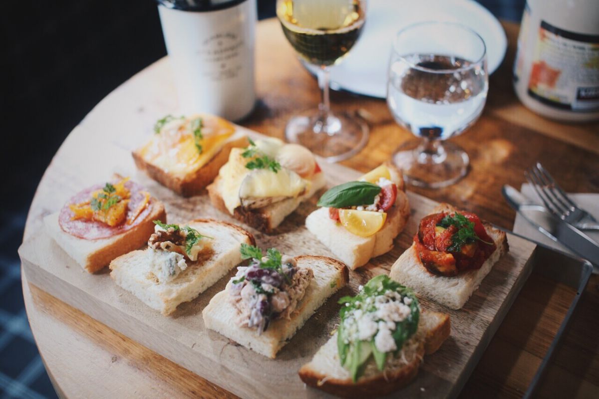 目黒の名店ONIBUS COFFEE監修のシングルオリジンコーヒーのほか、ワインをはじめとしたアルコール類を揃え、さまざまなシーンに合う食事を用意しています。なかでも魅力的なのが、夜メニューの「TOAST TOPPERS」(980円)。ひとくちサイズのトーストに4種の具材が載ったオープンサンドスタイルのおつまみです。具材は、チーズ&メープルやトマト&バジル、サラミ&ジャムなど8種類を用意し、好きなものを4つ選べるという斬新なスタイル。お酒に合わせてバリエーションを楽しんでみては?
