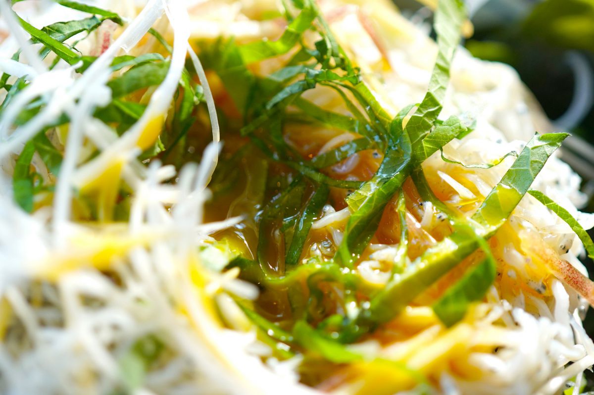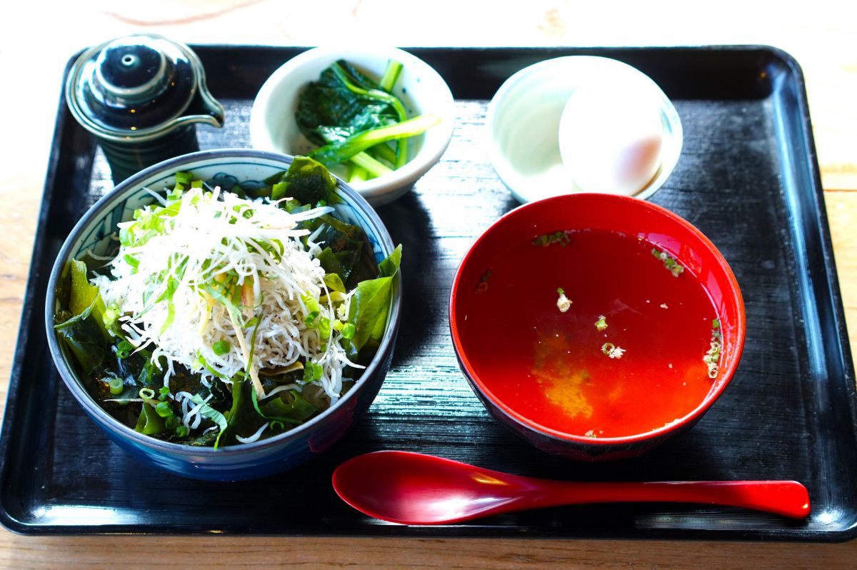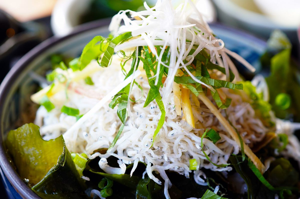 運ばれてきたどんぶりには、釜揚げシラスがてんこ盛り。天然若布の食感、大葉・ミョウガなどの薬味がコクのあるシラスのうま味を引き立てます。
