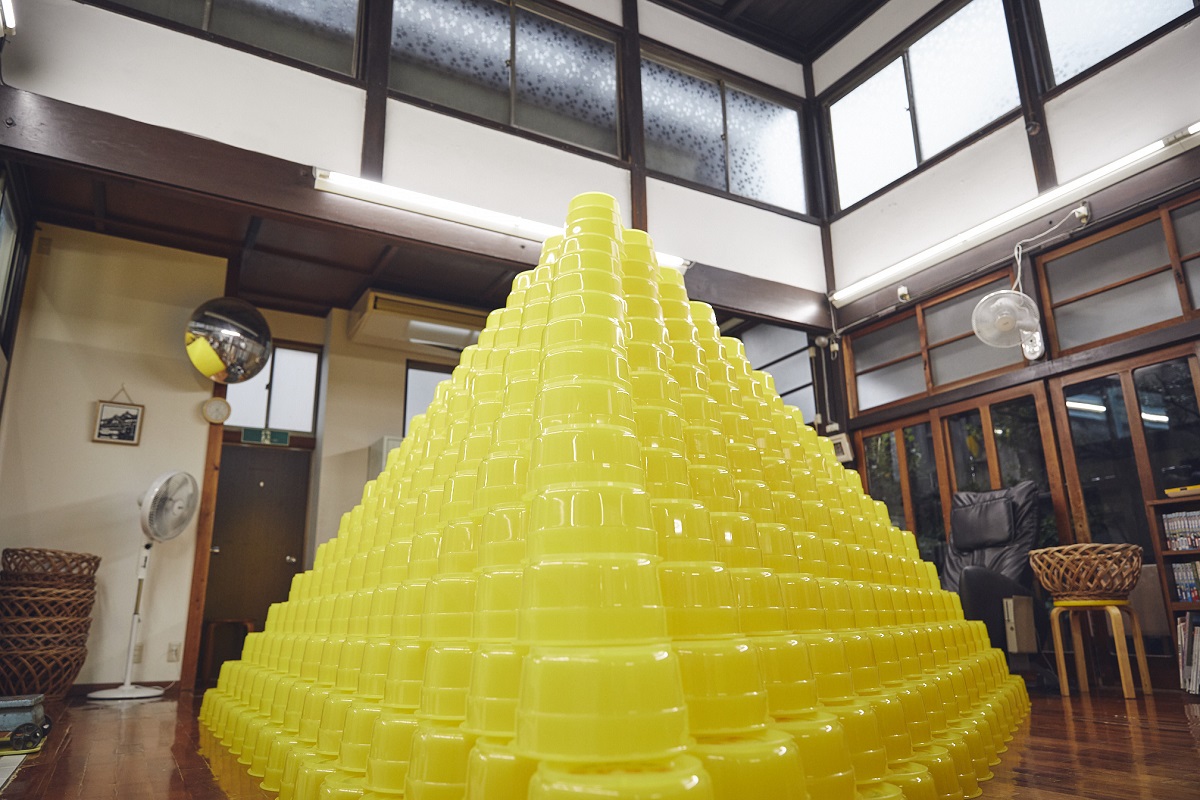 リチャード・ケロリーンの代表作(!?)といわれる、2024個のケロリン桶を使用した代表作「ケロリンピラミッド」は存在感あり!