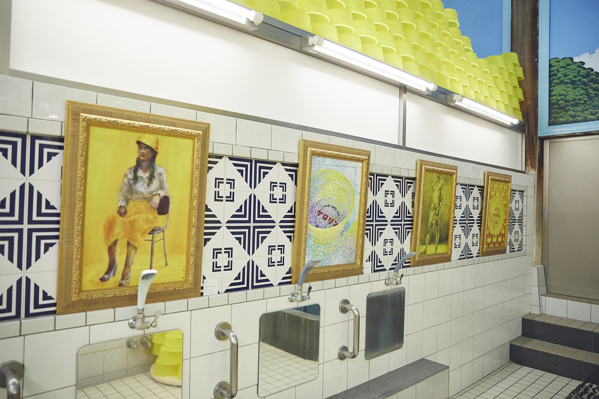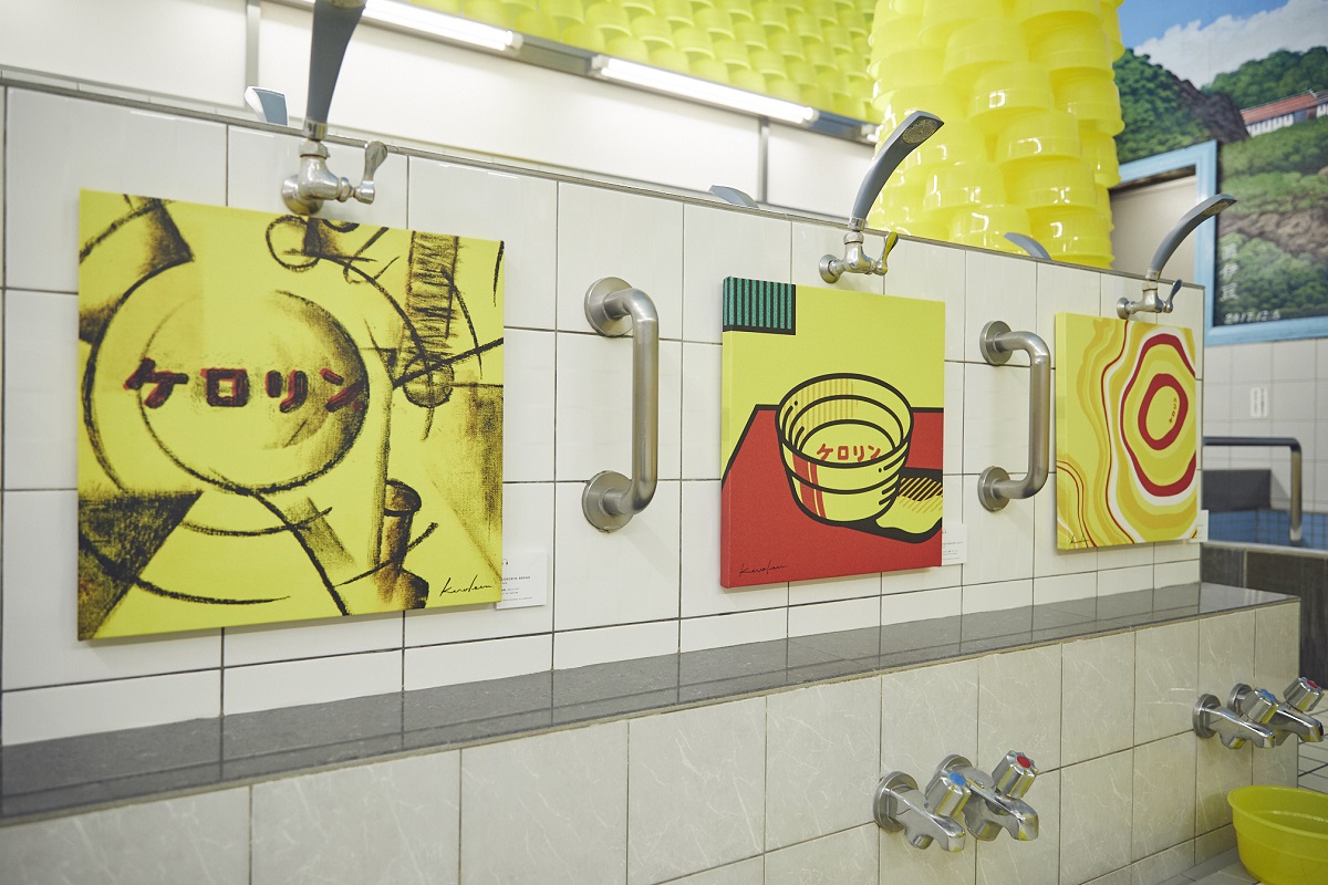 『ケロリンミュージアム』の開催は2日間のみ。ケロリン桶が積み上がる見ごたえありの作品やほのぼのとした絵画まで、銭湯内がケロリン色に包まれる、超期間限定のシュールなミュージアムは必見です!