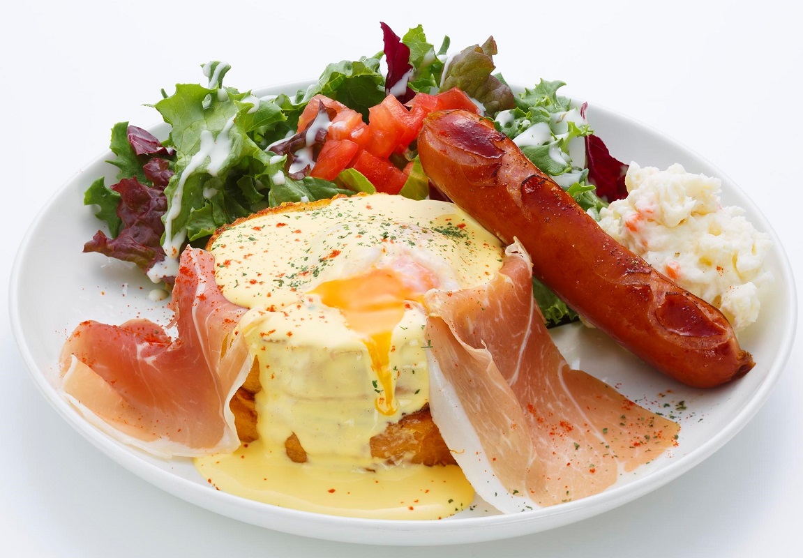 「エッグベネディクト」は、砂糖を使わず、砂糖の代わりにチーズを使ったアパレイユで作った“食事系”のフレンチトースト。フレッシュなサラダとアメリカンサイズのソーセージもついて、食べ応えあり!