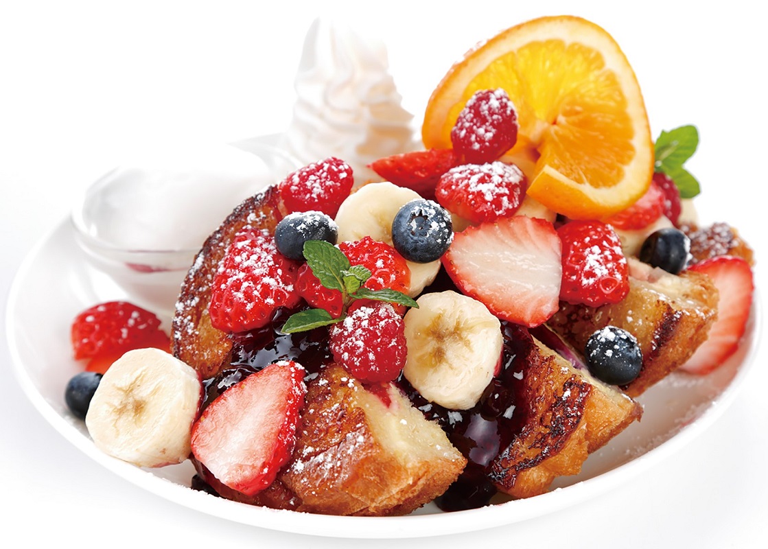 フレンチトーストにクリームチーズをサンドした「ベリーDX(※写真)」は、新鮮なストロベリーやラズベリー、バナナなどのフルーツがたっぷり!甘酸っぱいブルーベリーソースもたまりません。