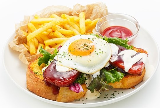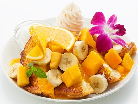 マンゴーとバナナをゴロゴロとトッピングした、那覇店限定のスイーツ系フレンチトースト「マンゴー」。クリームチーズをサンドしたフレンチトーストに、果肉たっぷりのマンゴーソースとココナッツシロップがかかっています。