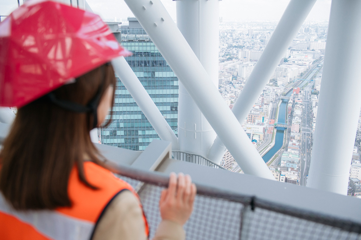 このツアーでは東京スカイツリーを支える柱に直接触ることもできます。大きな構造物に触れることで、その構造物からエネルギーを得て気概を高めることができるので、ぜひ触ってみて。
